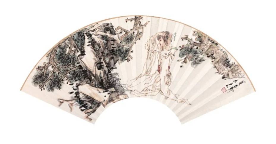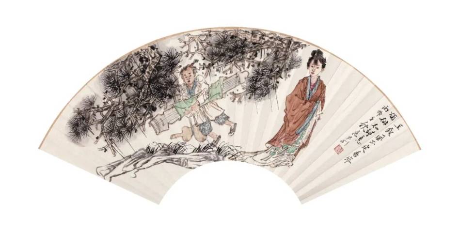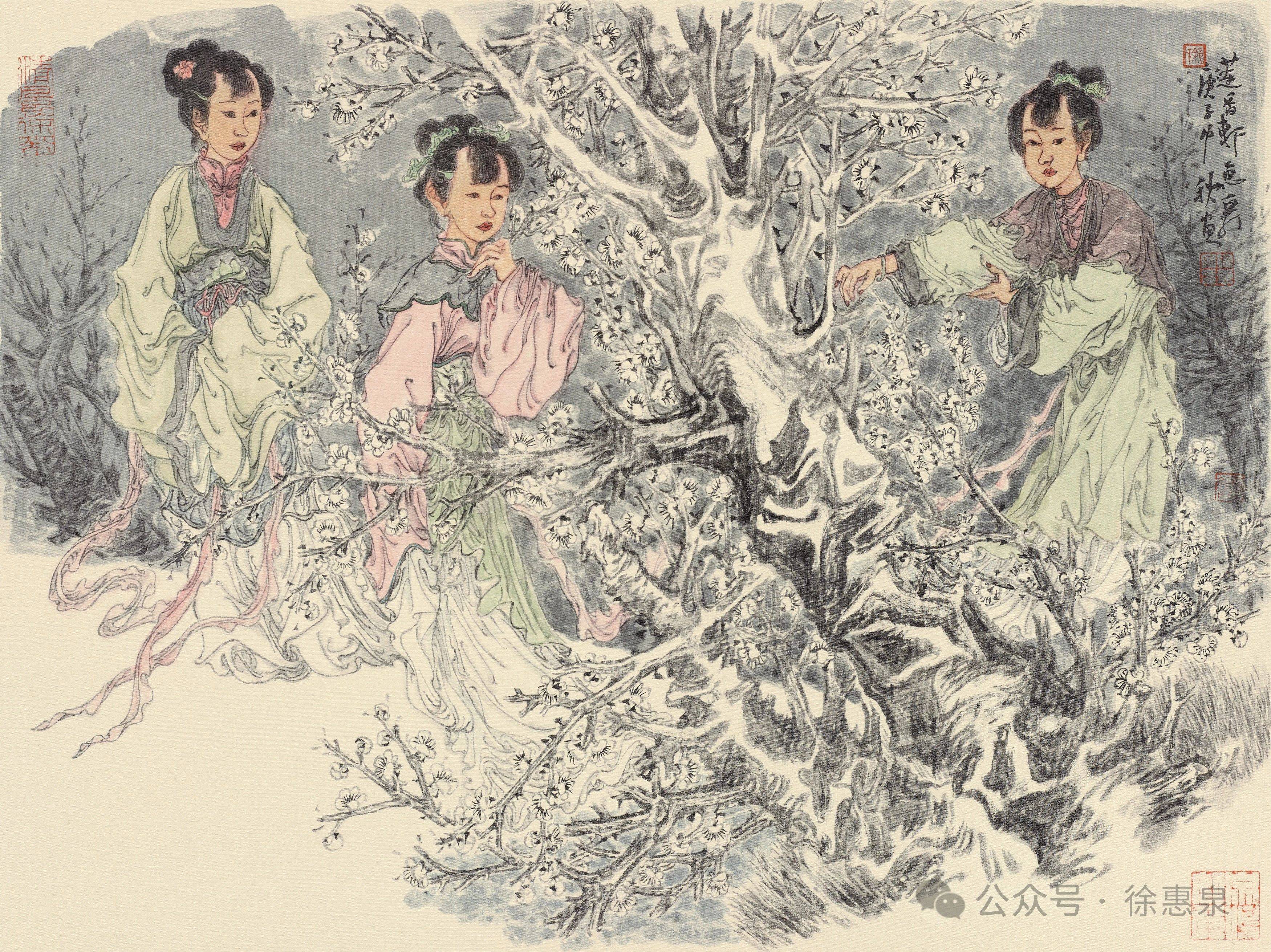 绘画说到底是一种自由的创造性的精神生活,正如石涛所言“夫画,天下变通之也。山川形势之精英也,古今造物之陶冶也,阴阳气度之流行也,借笔墨以写天地万物而陶泳乎我也”(《石涛画语录·变化章》),一切艺术都应该回归人本身。徐老师温润、儒雅、谦逊、好学不倦,对世界充满悲悯与同理心,令人如沐春风。他生于苏州,长期浸润于人文荟萃、山明水秀的江南繁华之地,苏州园林的佳胜更是滋养了他的人文情怀,赋予了他的作品山林水泽之气,他仕女画中的环境营造多取材于此。但是我认为他在仕女画中所铺陈的环境,比苏州园林更有野趣,古木阴翳,草树丰茂,山重水复,曲径通幽,飞瀑流泉,绕石而鸣,传达出一种静穆空灵、哲学诗意的山水精神。甚至可以说,徐老师笔下的山川树石,充当的不仅仅是人物衬景的铺陈,而是山水画与人物画的密切结合。徐老师的作品非常注重人物跟环境的关系,将人物自然地植入山水之间,人物仿佛真正地生于斯,长于斯,通过人物的姿态、衣纹,衣纹的皱褶、线条,与其后面的背景形成活性的互动关系,构建人物与山石树木的线条之间的关联,通过形式上的关联进而构建其内在的精神链接,有时以书入画,有时万毫齐力,有时牵丝映带。他的山水颇有林泉高致的幽趣和绵邈宏大的气象,山水之间的仕女也因此具有了林下之风,表现出远离俗世喧嚣的清静之美。烟霞尽处是诗行,一如屈原《山鬼》中所描绘的“若有人兮山之阿”,虽未“被薜荔兮带女萝”,但是确乎“既含睇兮又宜笑”,“折芳馨兮遗所思”。