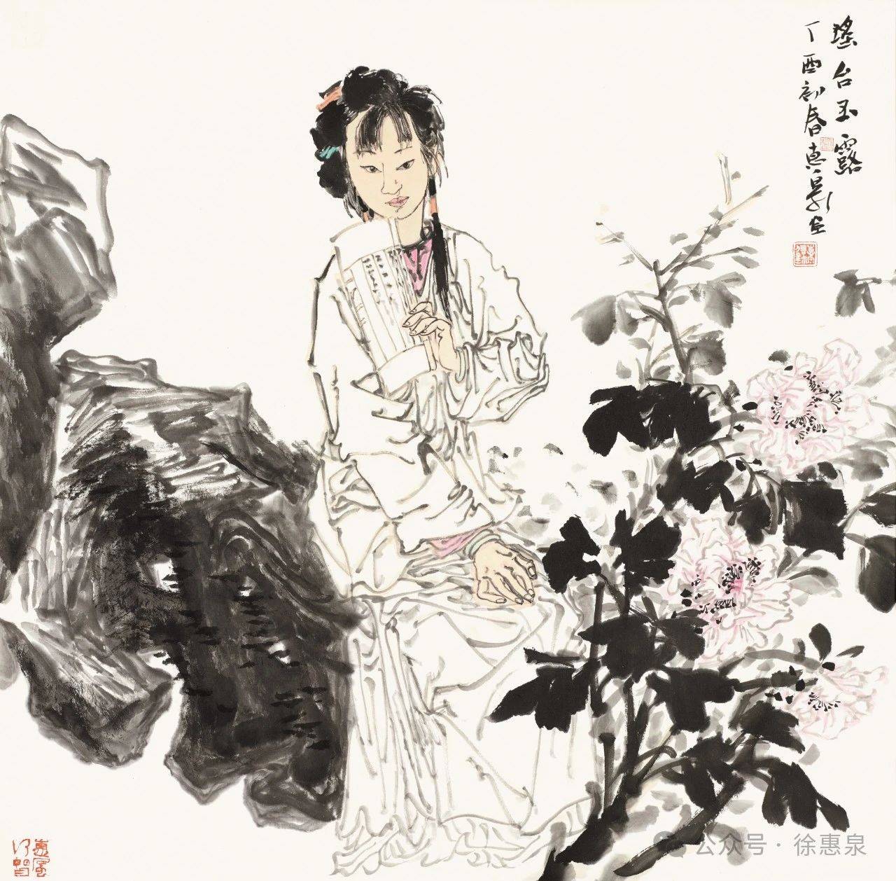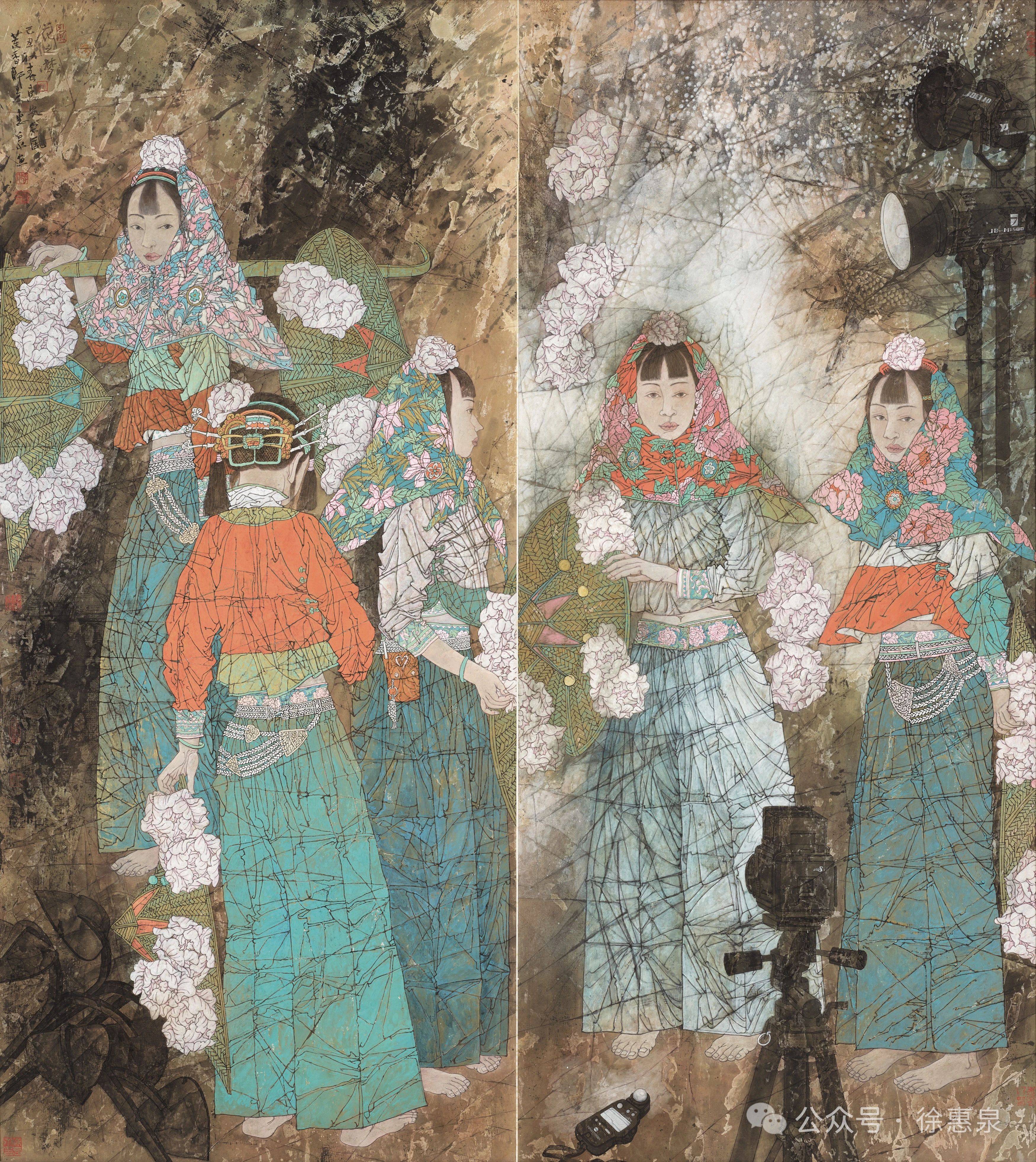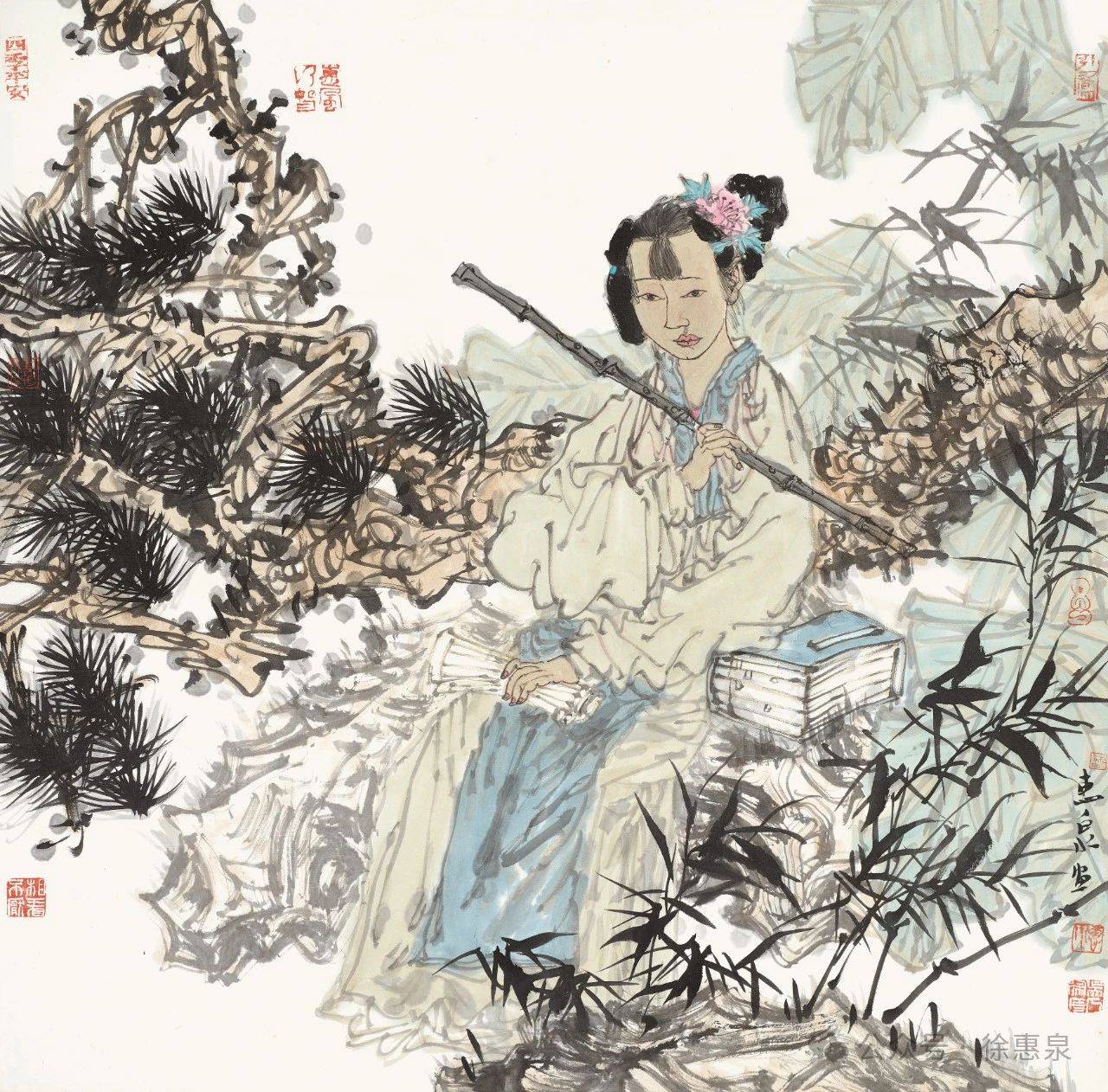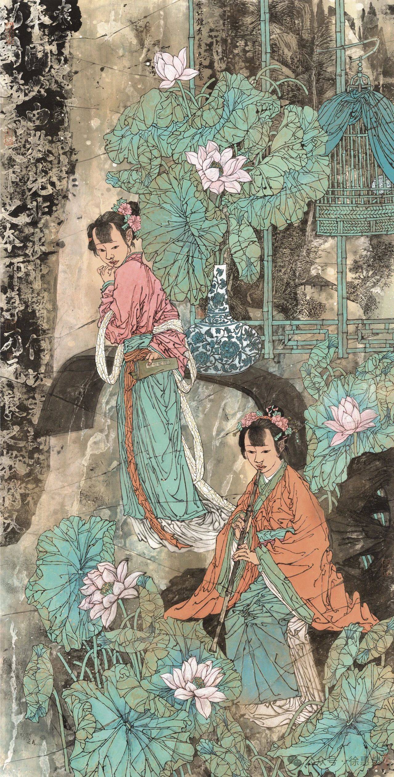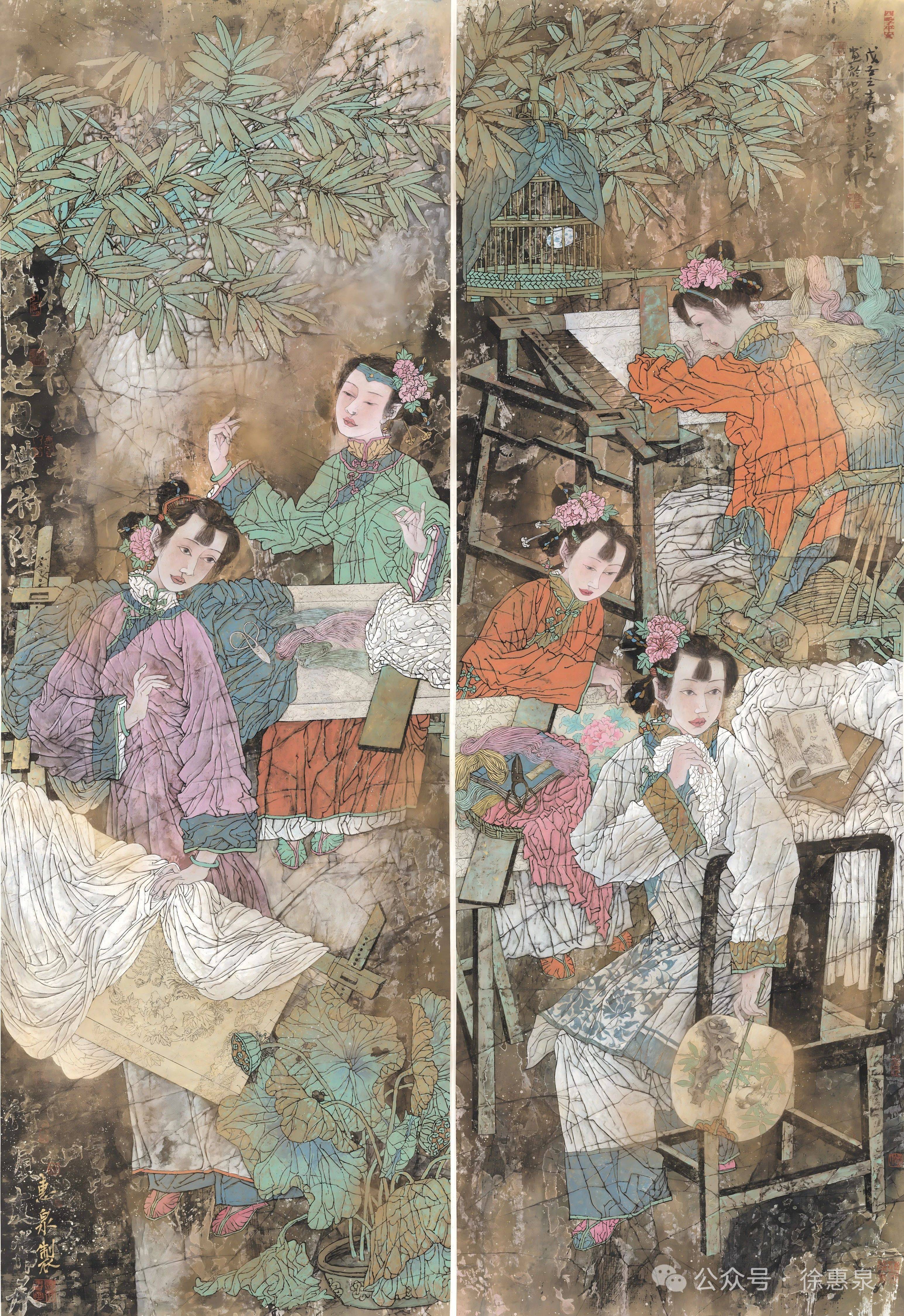 盘点徐惠泉老师的仕女画,无疑是符合这几个标准的,写意所涵纳的精神性、思想性、情感性、技术性,以及适度的程式化表达、婉约的画风、优美的意境所营造的诗性,使得他的仕女画自成一派,自然娴静,婉约典雅,克制内敛,强调一种内外兼修的气质,但又不失其个性表达。徐惠泉老师自己对他的绘画进行反思时,也强调了写意的重要性:“现代艺术注重个性的张扬,注重自我,注意创新,亦强调综合,强调多样,博取众长,和而不同。以‘工’和‘色’‘形似’和‘制作为特质的工笔重彩画如何保持其优势的同时,去除在当下‘重彩热’过程中出现的甜熟板滞、肤浅、匠气的弊病,需要艺术家长期孜孜不倦地向传统学习,更多注入文人水墨画的养分,以开阔的艺术视野不倦地创造努力,把‘墨彩’绘画提升到‘写意’‘写神’‘写心’的现代艺术境界。”